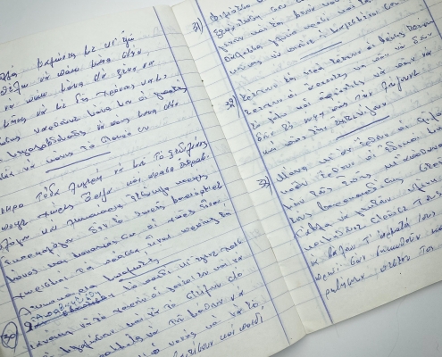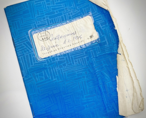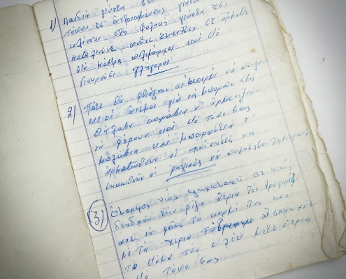 Όταν πήγαινε στην πρώτη γυμνασίου, η δασκάλα της ωδικής κα Λαγουδάκη, ρώτησε αν ξέρει κάποιος να τραγουδήσει ένα παραδοσιακό τραγούδι. Ο πατέρας μου, τότε κοντός κι αδύνατος, σήκωσε το χέρι κι είπε ένα ριζίτικο. Η δασκάλα του ενθουσιάστηκε και τον φίλησε κι έλεγε “πώς ένα τόσο μικιό κι αδύνατο κοπελάκι, τραγουδά τόσο ωραία τα ριζίτικα”.