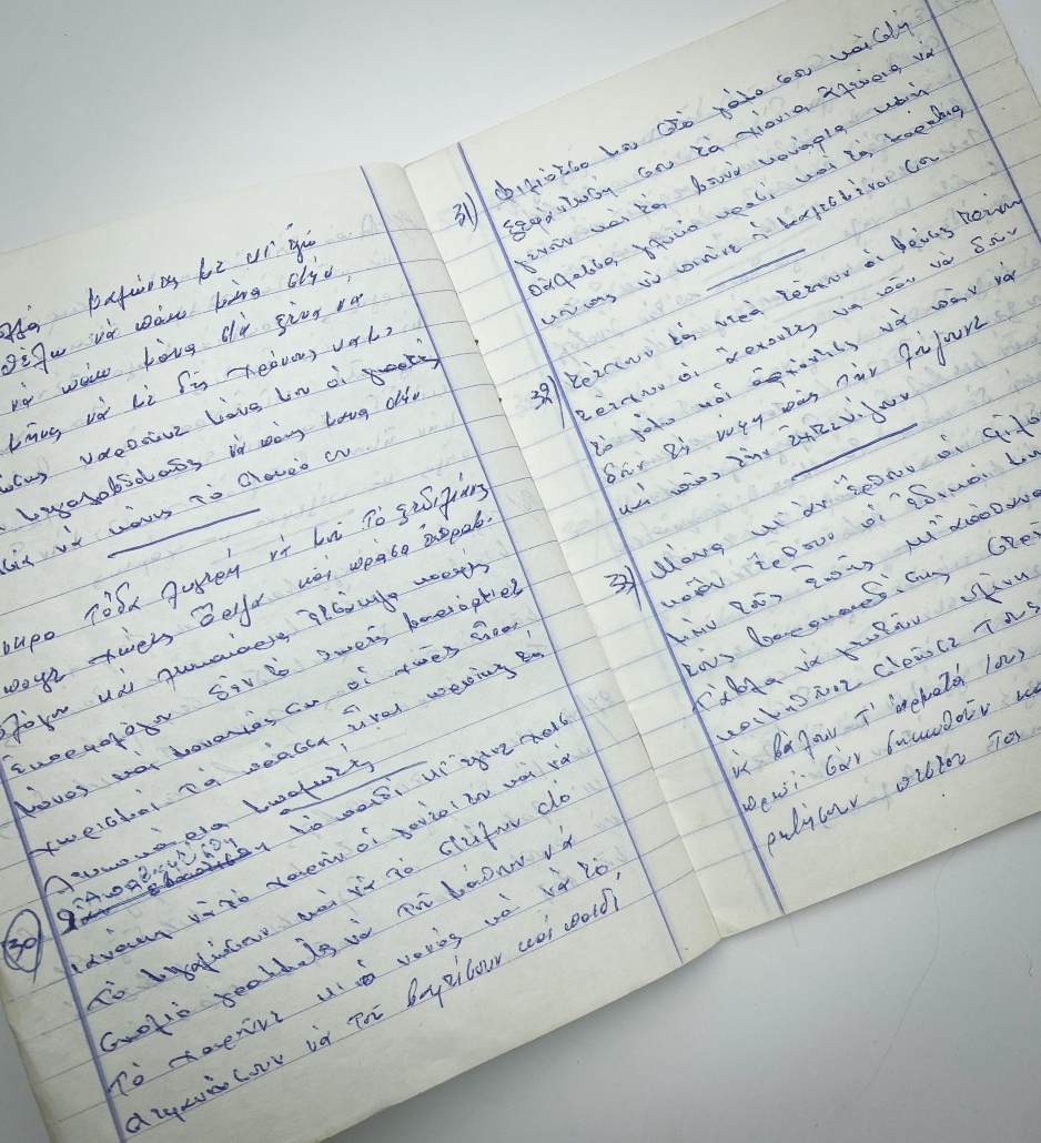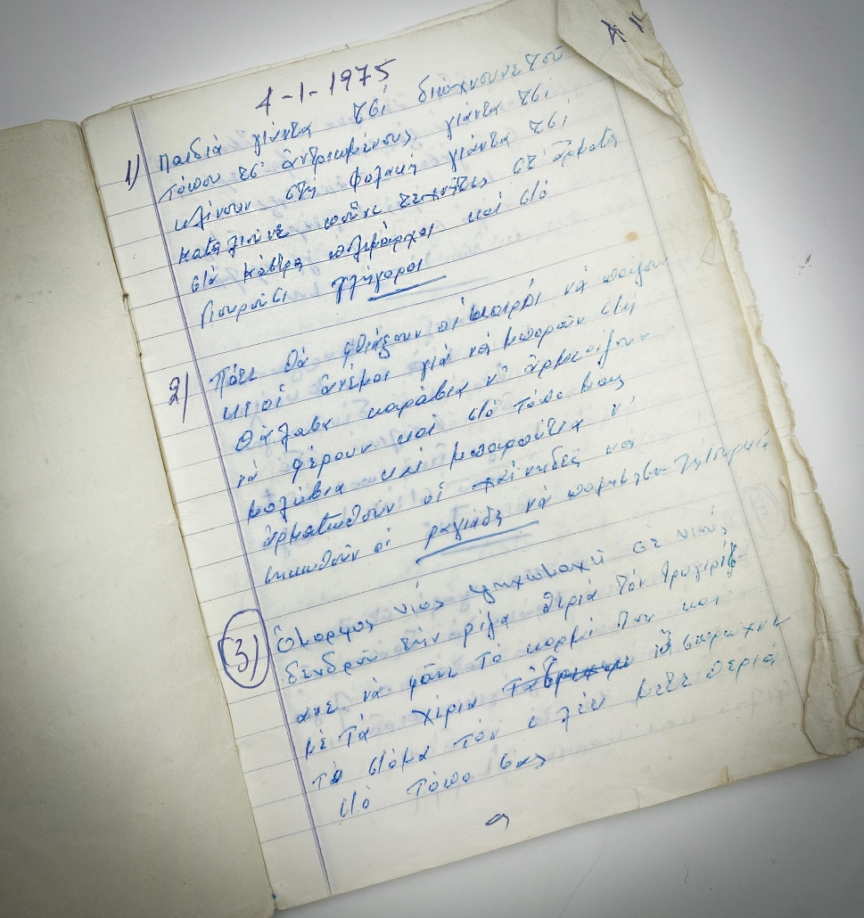 Όταν πήγαινε στην πρώτη γυμνασίου, η δασκάλα της ωδικής κα Λαγουδάκη, ρώτησε αν ξέρει κάποιος να τραγουδήσει ένα παραδοσιακό τραγούδι. Ο πατέρας μου, τότε κοντός κι αδύνατος, σήκωσε το χέρι κι είπε ένα ριζίτικο. Η δασκάλα του ενθουσιάστηκε και τον φίλησε κι έλεγε “πώς ένα τόσο μικιό κι αδύνατο κοπελάκι, τραγουδά τόσο ωραία τα ριζίτικα”.
